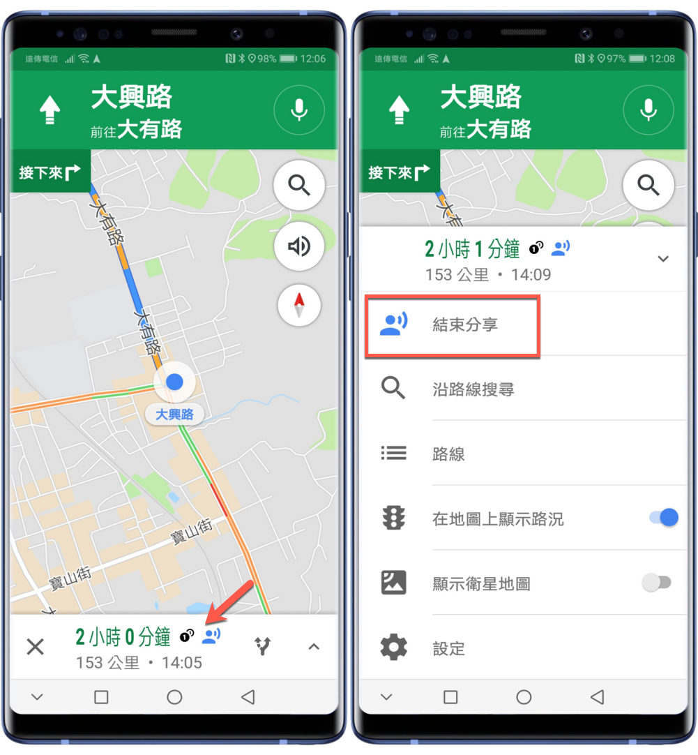 首先,設定好要出發的目的地,並進行導航,點擊右下角的選單後,就會看到「分享行程進度」可以選擇。