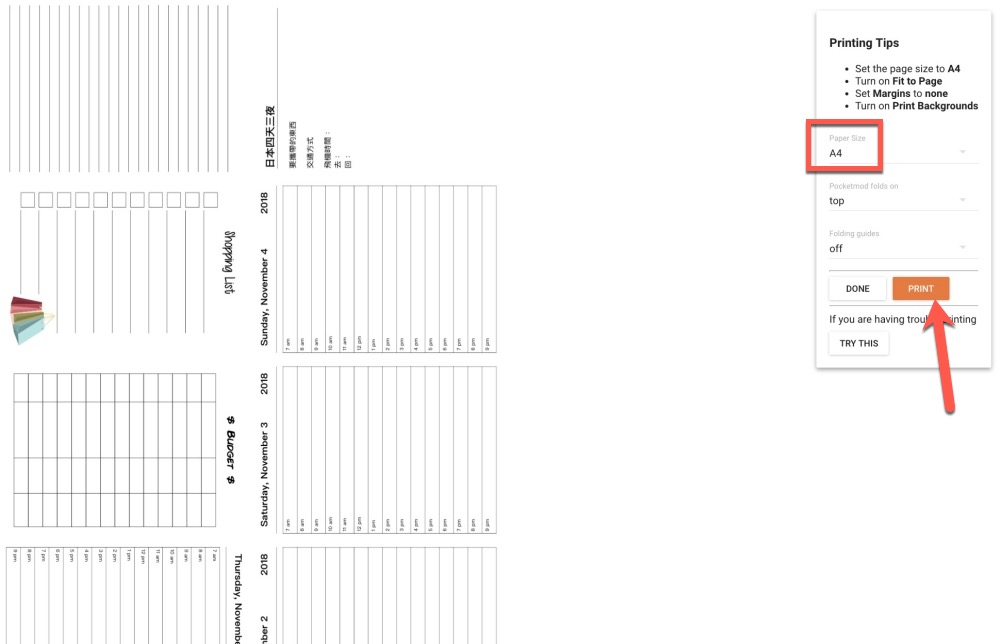 這頁是預覽列印畫面,記得 Pager Size 要選 A4,其他建議像是無邊界列印,開啟列印背景等,如果你的列印選項裡有這些就注意一下,沒有就隨意。