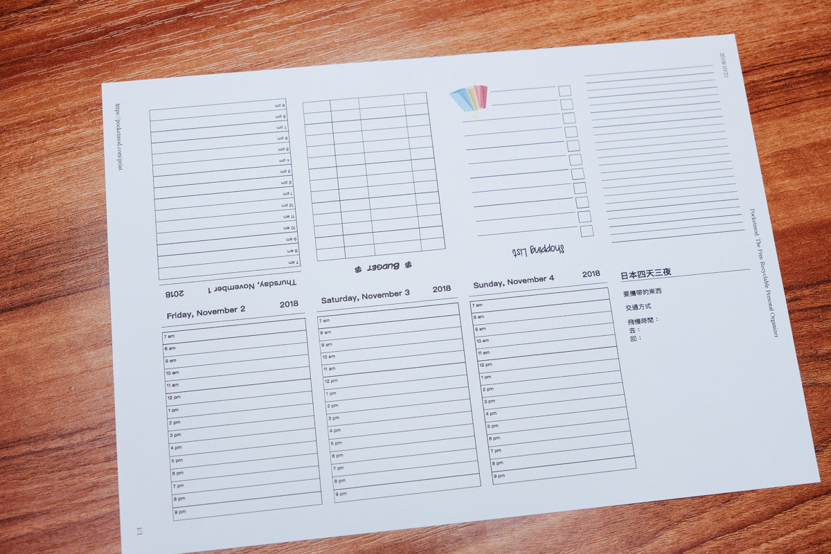 阿湯今天發現一個線上服務還蠻方便的,就是可以讓你用一張 A4 印製出 8 頁的口袋書,不論是平常旅遊、記事都很好用,當然如果想用來做小抄也是可以啦(但太大張可能會被發現..XDD),這個 Pocketmod 網站提供很多既有的模板,像是日/週/月行程表、空白頁、預算表、預購清單等,非常多可以選擇,透過安排每頁的排版後,印製出來再用點技巧折一折就可以變成可以翻頁的 8 頁口袋書,非常實用。