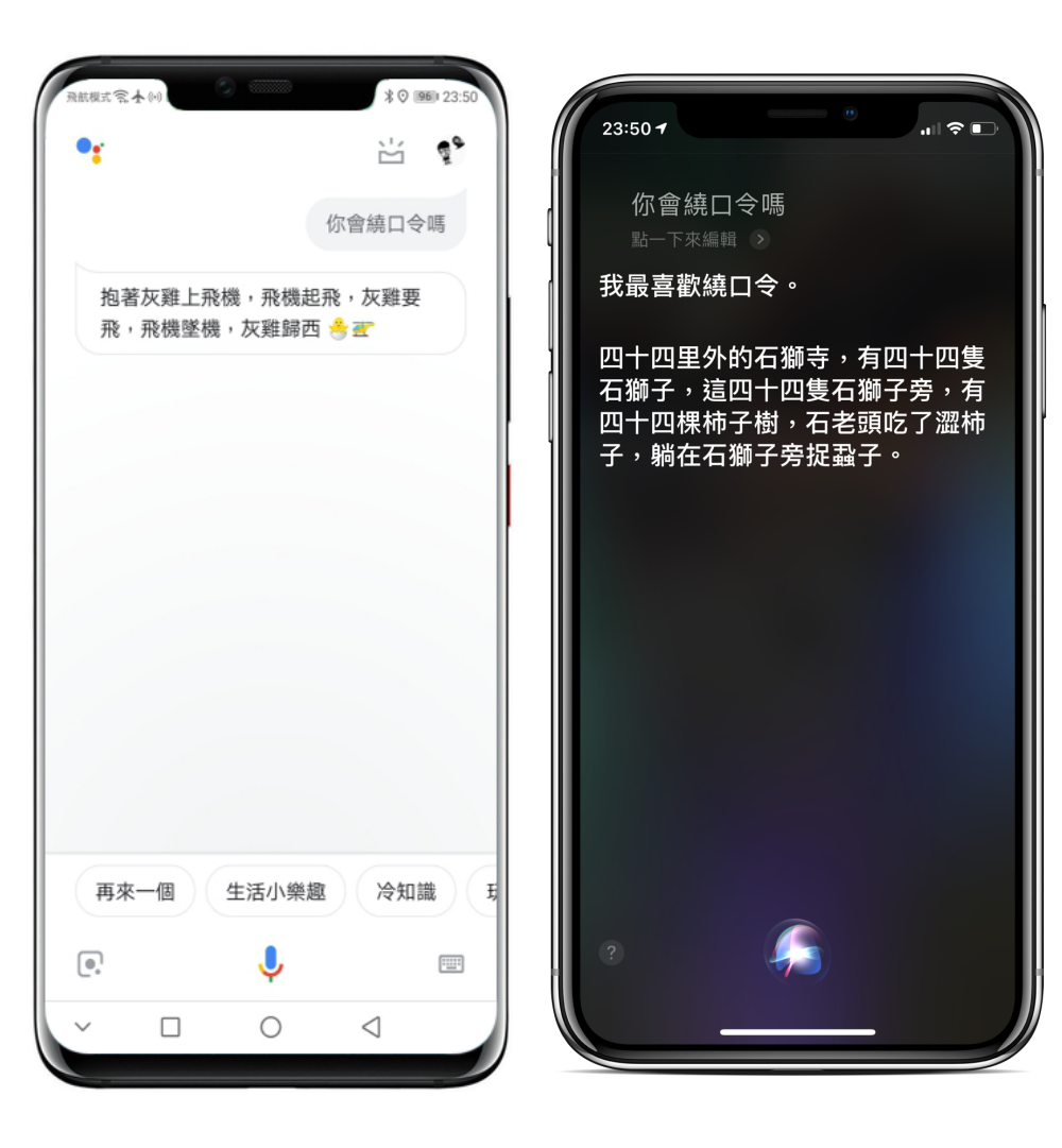 繞口令,二個都很會,不過 Siri 的繞口令真的不太更新,都是那幾個啊。