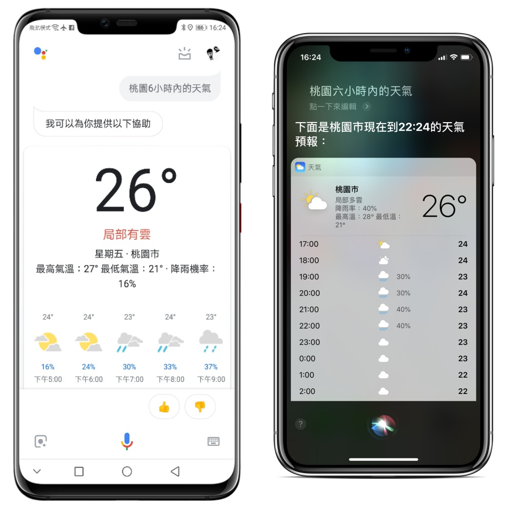 天氣查詢基本上一定都沒有問題,所以阿湯來測一下更精準的,查詢 6 小時內的天氣,Google 跟 Siri 看起來似乎給出的答案是查不多的,不過實際測試後發現 Google 不論是講幾小時內的天氣,基本上就是給你桃園今天的天氣,然後往右滑動可以查看後面時間的天氣,而 Siri 是真的給你幾小時內的天氣。