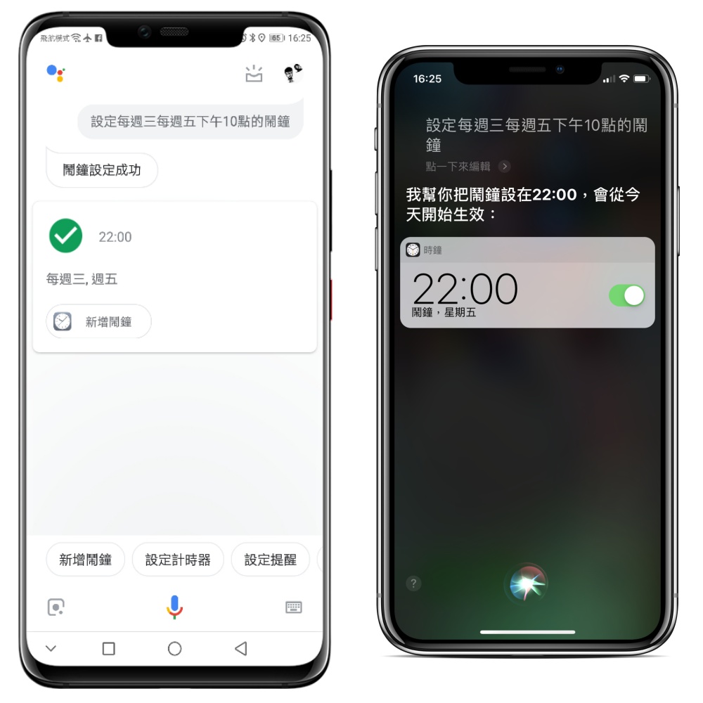 設定鬧鐘的部份是 Google 略勝一籌,單次鬧鐘設定都很簡單,只要講要設定幾點,但要是加入週期、星期的條件就複雜很多,像阿湯就測試了每週三及週五的下午十點,Google 可以成功的設定出來,而 Siri 僅加入了週五,不論阿湯怎麼換指令都是一樣的結果。