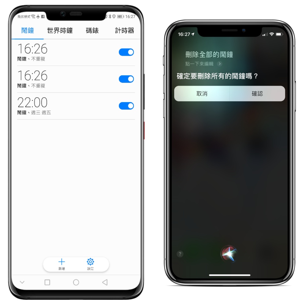 當鬧鐘每天用語音設定多了之後,應該就會想一次清空鬧鐘,給二邊的指令都是刪除全部的鬧鐘,Google 是直接跳到鬧鐘頁面要你自己刪除,Siri 則是跟你做確認是否要刪除全部的,便利很多。