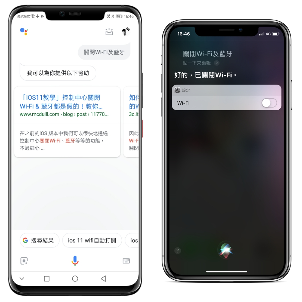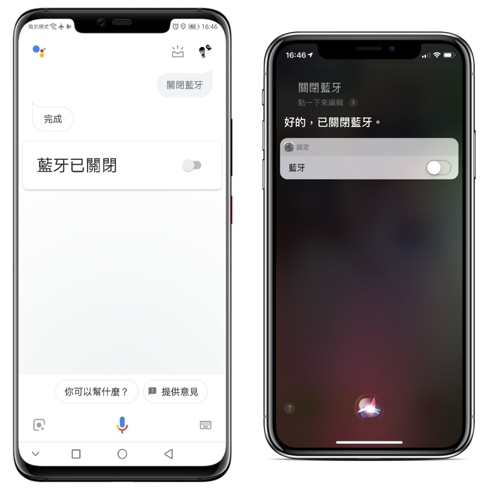 控制的部份,一次關閉或開啟手機某個功能是沒問題的,像是 Wi-Fi、藍牙、聲音等,但如果指令是一次關閉多個的話,Google 無法辨識,Siri 則是只辨識第一項,換了各種說法也是同樣的結果。