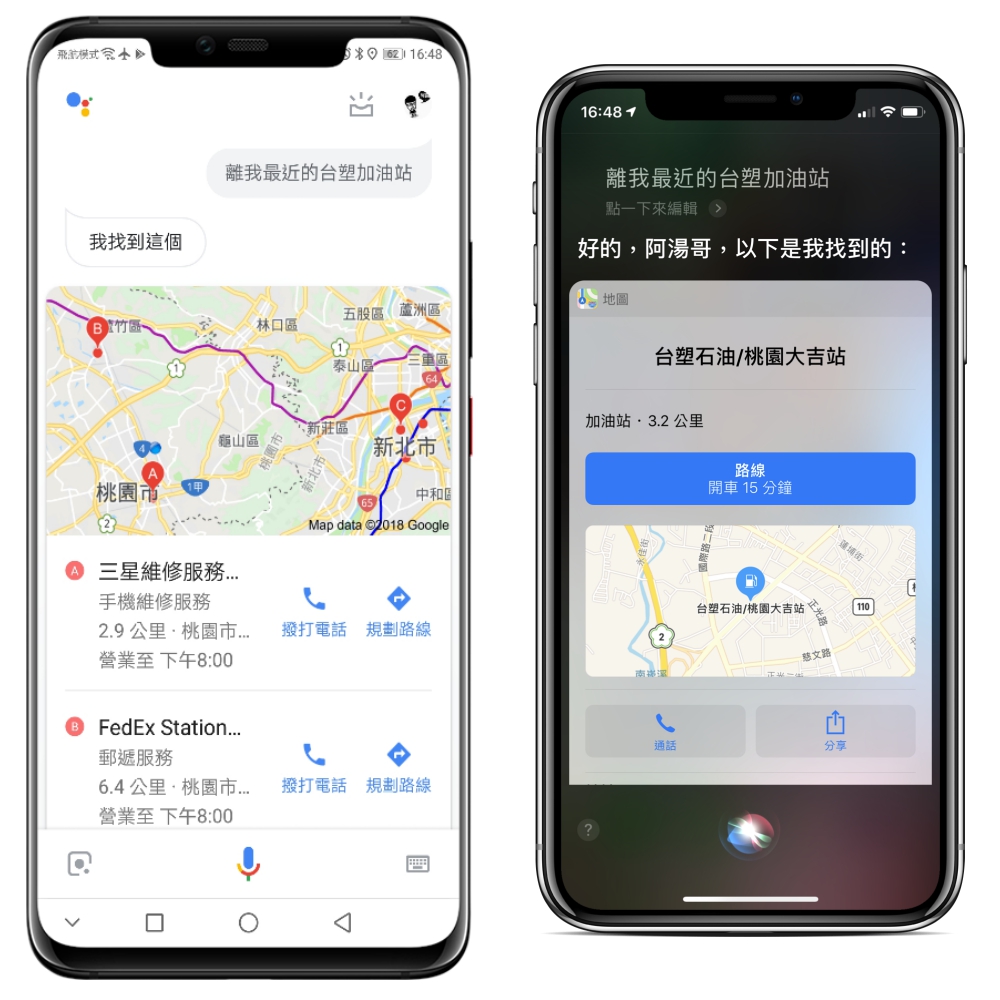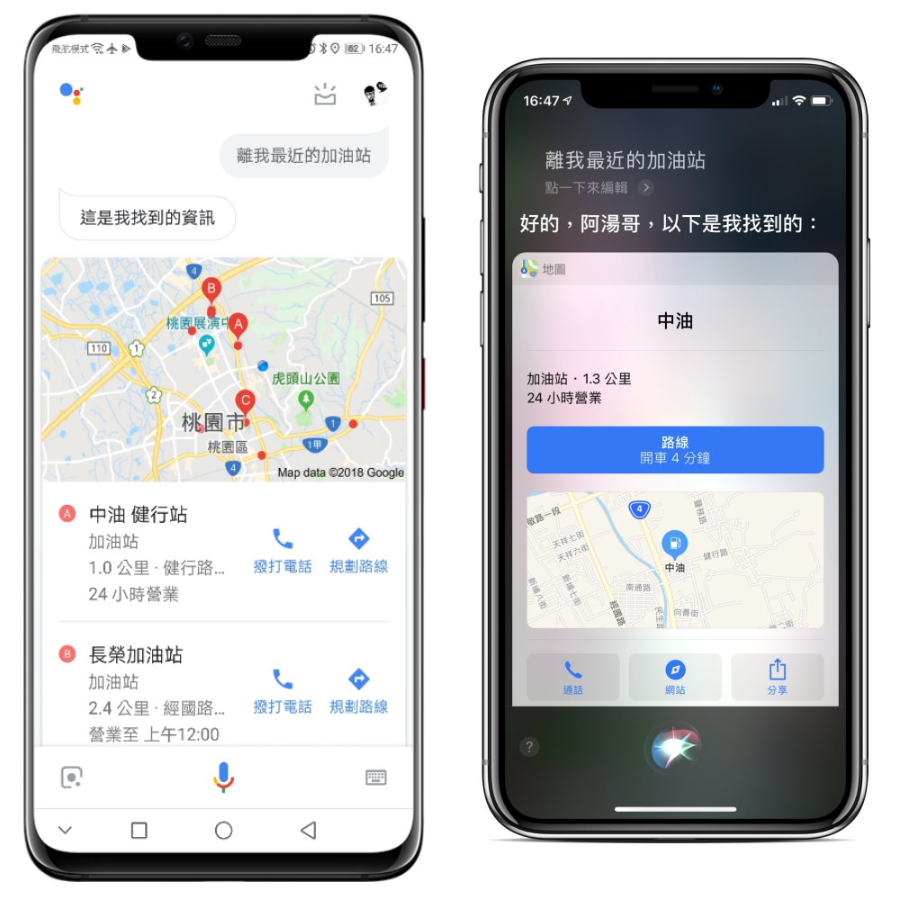 加油站的部份,阿湯再深入的測試了加入「公司品牌」,Google 無法辨識台塑的加油站(但中油可以),Siri 則是沒問題,各品牌幾乎都能搜尋。