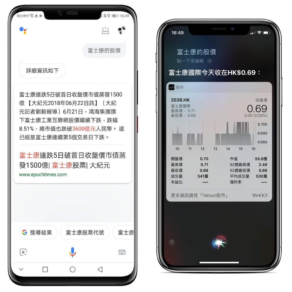 這功能其實沒什麼好介紹的,但阿湯無聊的測試了一下才發現原來還是有差,比如我查富士康的股價,Google 居然沒收錄到資料庫,Siri 則是有。