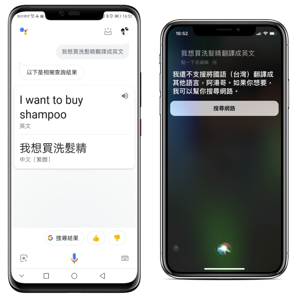 最後來測一下翻譯的功能,Siri 一直到現在還是沒有翻譯語言的能力,這部份稍稍可惜,而 Google 畢竟有自己的翻譯功能,當然結合到語音助理只是小菜碟,如果在 iPhone 上你也想用 Siri 的翻譯,可以參考阿湯這篇