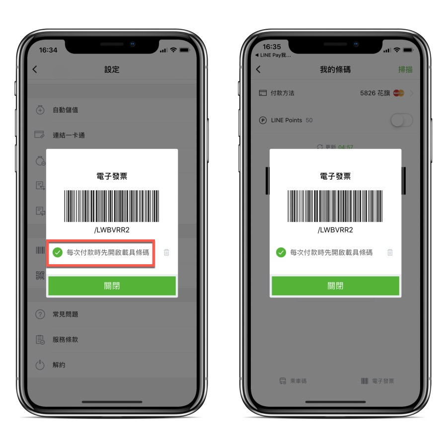 那之後要怎麼呼叫這手機條碼來讓商店直接載入電子發票呢?如果你是使用 LINE Pay 的話,預設是會在你付款時就順便開啟條碼,方便使用。