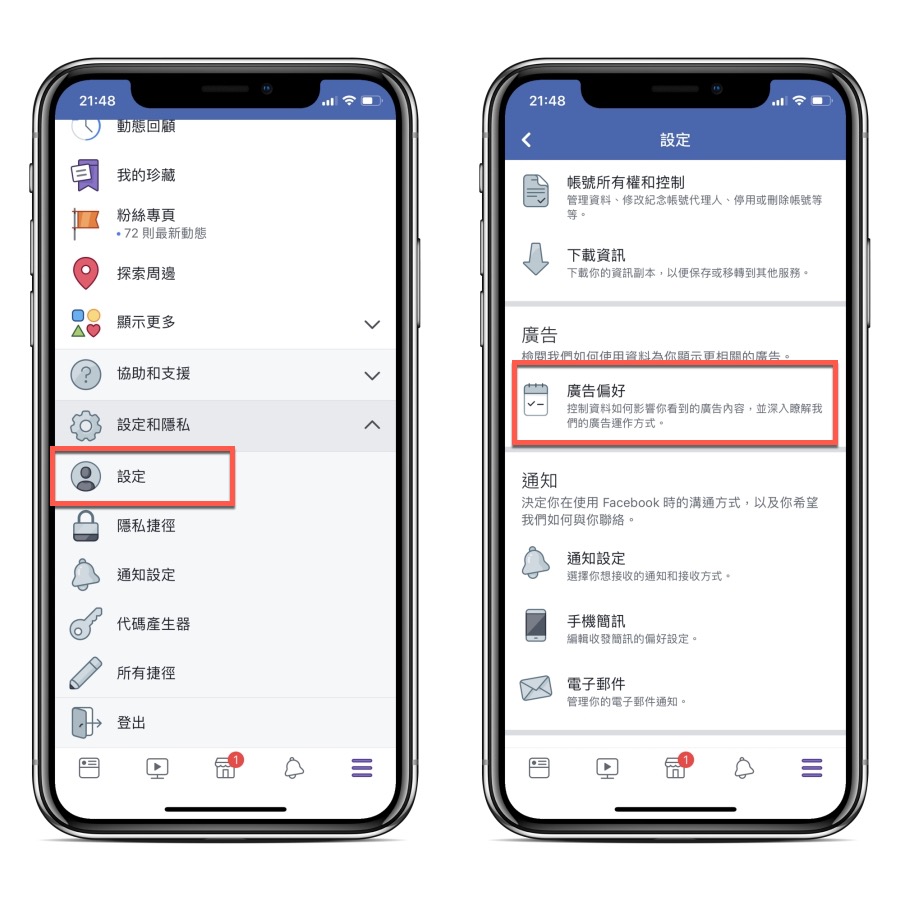 首先在右上角的選單下拉後進入「設定」,再點選左邊的「廣告」。