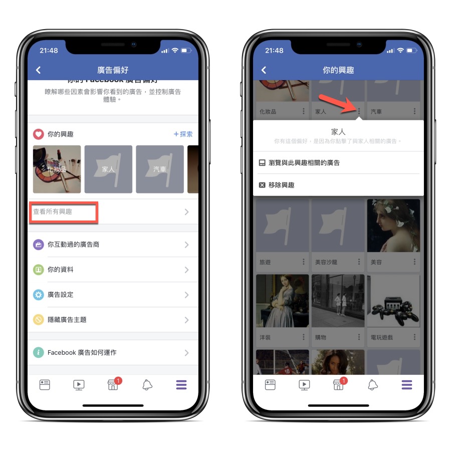 這邊開始就會看到你的興趣、你互動過的廣告商等。