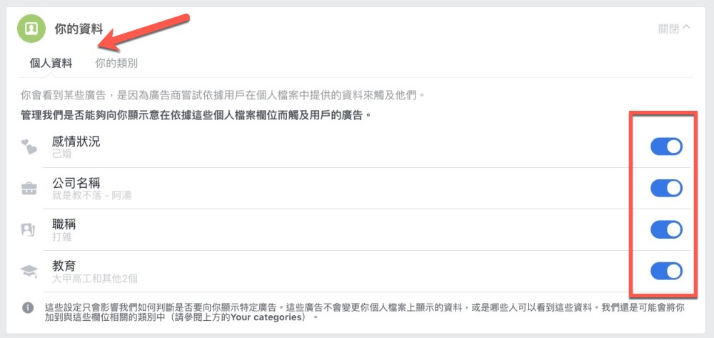 再來是你的資料,Facebook 的個人資料裡,你自己都有選擇是否要公開顯示,而公開顯示的那幾項基本上也可以被列入廣放廣告的條件之一,因此你可以在這裡選哪些基本資料不要被加入觸及,基本上在這裡關掉只會影響廣告,原先的個人設定是不影響的。