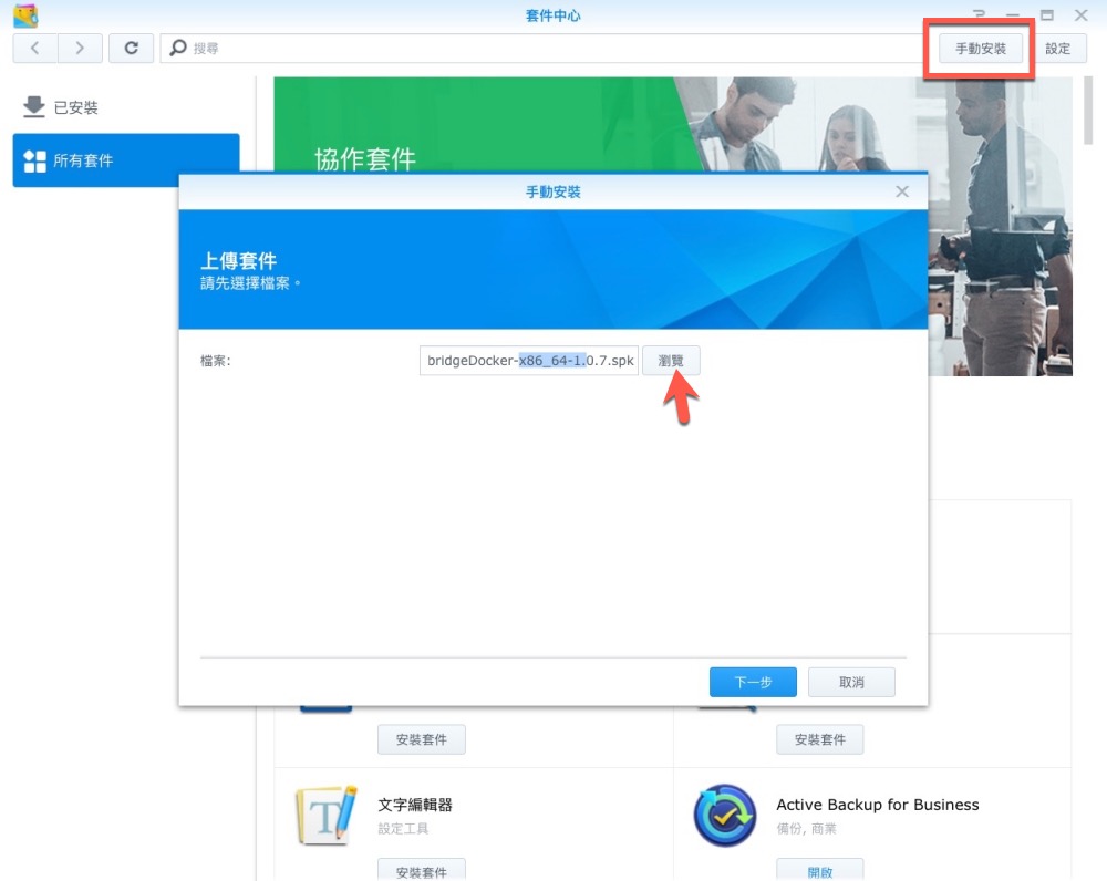 然後在套件中心右上角點擊手動安裝後,選擇我們下載的 SPK 檔案,按下一步進行安裝。