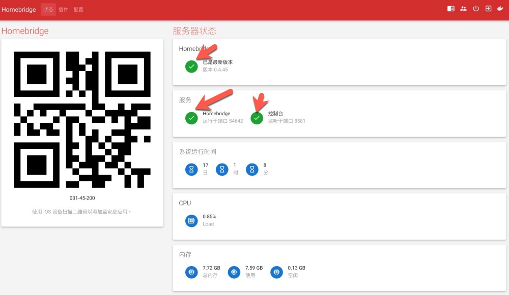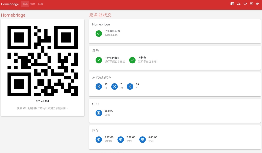 進入後就會看到這樣的頁面,會有一個大大的 QR Code,以及 Homebridge 的狀態,這時可以先拿起你的 iPhone 或 iPad 開啟家庭 APP 來掃描 QR 加入 Homebridge。
