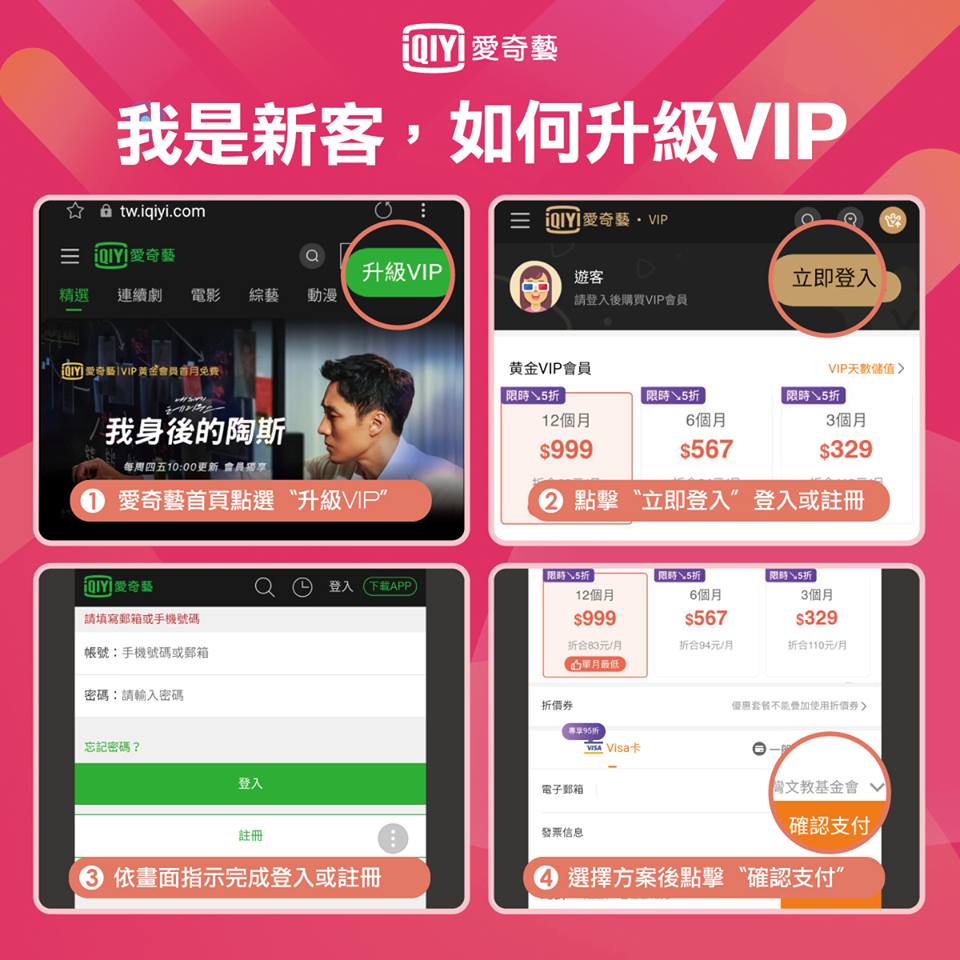 進入愛奇藝首頁後,點擊「升級 VIP」就可以挑選想要購買的優惠方式後結帳。現有會員也不用擔心,這項優惠會自動從你目前的會員到期日往後遞延唷!