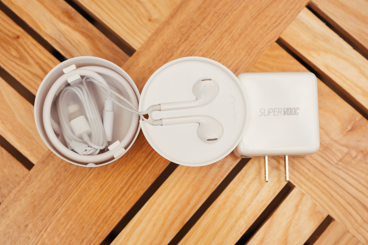 由於 R17 Pro 拿掉了 3.5mm 耳機孔的設計,附贈的耳機也是 Type-C 規格的接頭,另外也附有 Super VOOC 超級閃充專用的變壓器,記得要搭配他們附的傳輸線,才能獲得最快的充電速度,這超級閃充只要 10 分鐘就可以充電 40%,沒電時只要充一下又可以用個半天了。