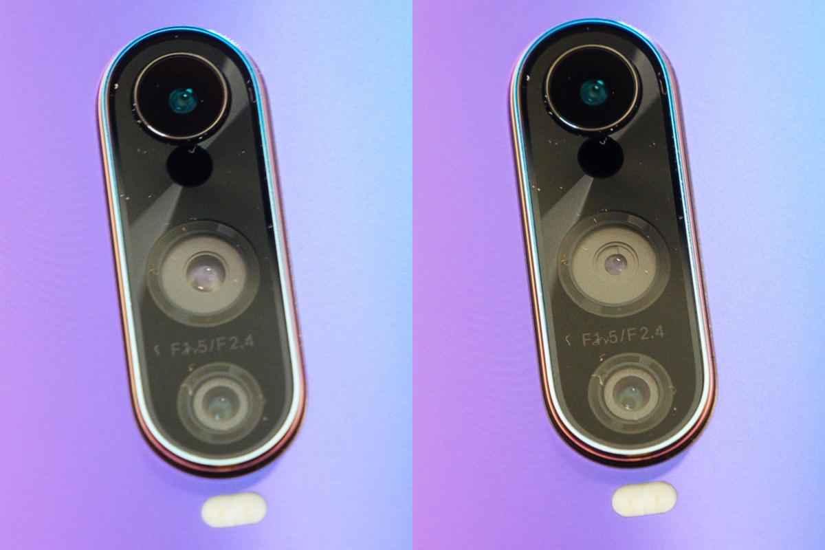 主相機這次搭載了三顆鏡頭,最上方為 TOF 3D 鏡頭,目前尚未有功用,之後會透過韌體更新開放拍攝 3D 照片的功能,第二顆鏡頭是具有具有 F1.5/F2.4 靈動光圈的雙光圈鏡頭,會依據環境光源自動切換 F1.5/F2.4 的光圈來使用,原則上光源只要偏較暗的狀況就會切換為最大光圈 F1.5 的模式,而第三顆輔助鏡頭為 2000 萬像素 F2.6。