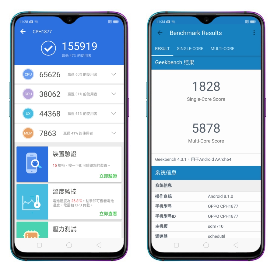 效能的部份,透過安兔兔的測試獲得 155,919 分,Benchmark 單核 1,828 分/多核 5,878 分。