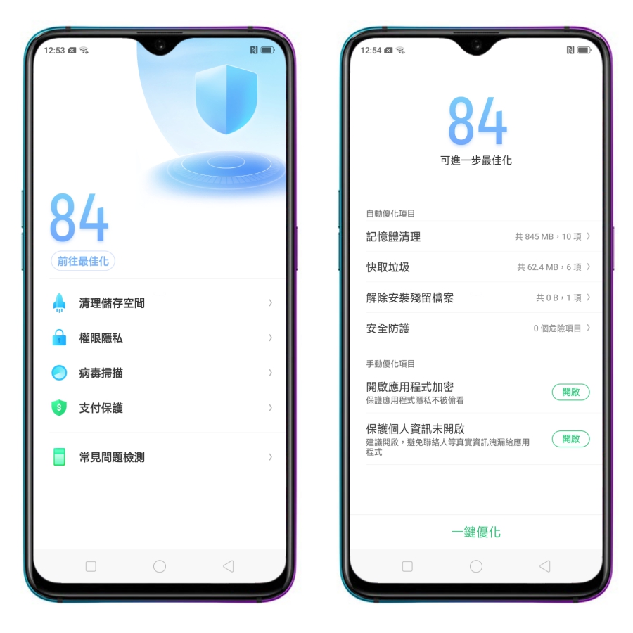 系統效能就跟電腦一樣,其實要定期清理垃圾或優化才會維持著最佳效能,內建也有著一鍵優化的功能,推薦大家可以不定期的按一下。