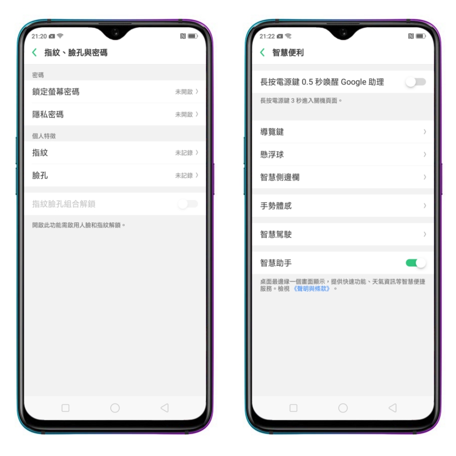 安全性的部份除了指紋辨識外,同時支援臉孔辨識,且可以同時啟用,在解鎖時可以二擇一使用。