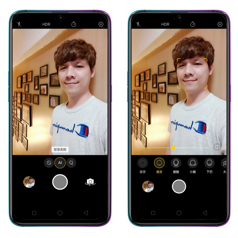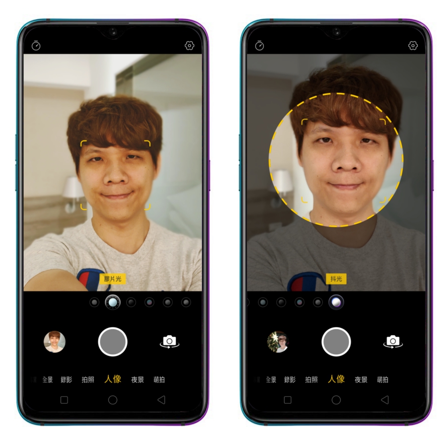 有些手機在自拍時,若是半臉有陽光直射,半臉為陰影,會造成有陽光的地方大過嚗,或者是陰影的地方過暗,但 OPPO R17 Pro 在自拍的光源處理上明顯的相當自然。
