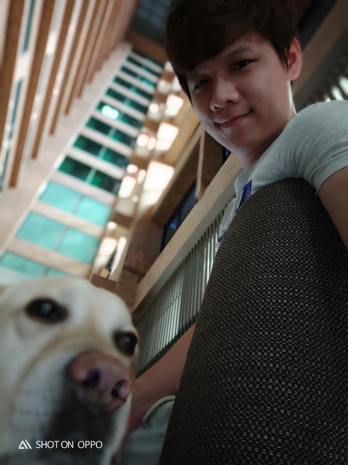 而自拍的部份,這是在很昏暗的飯店吧檯所拍攝的,面對頭頂的微逆光還是有很不錯的表現,然後一隻拉不拉多亂入了。