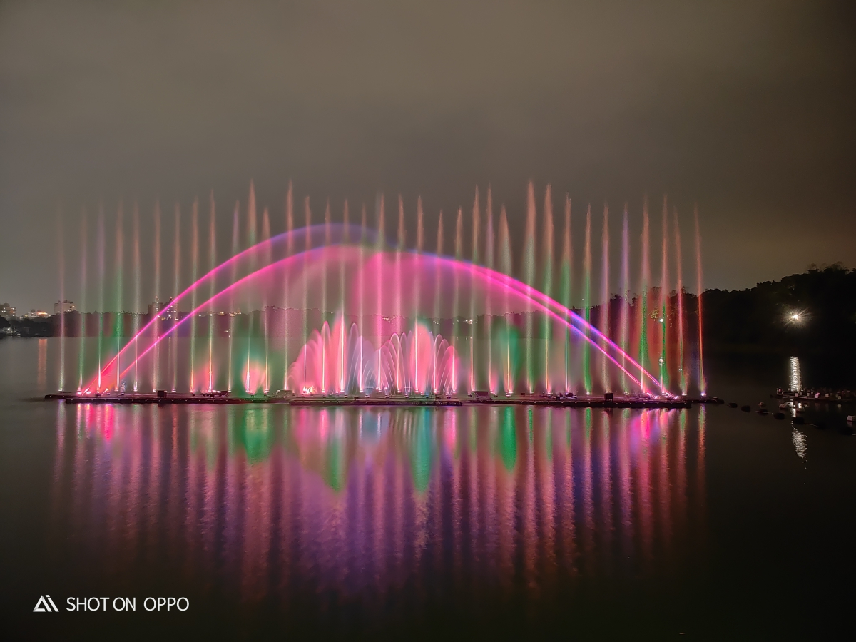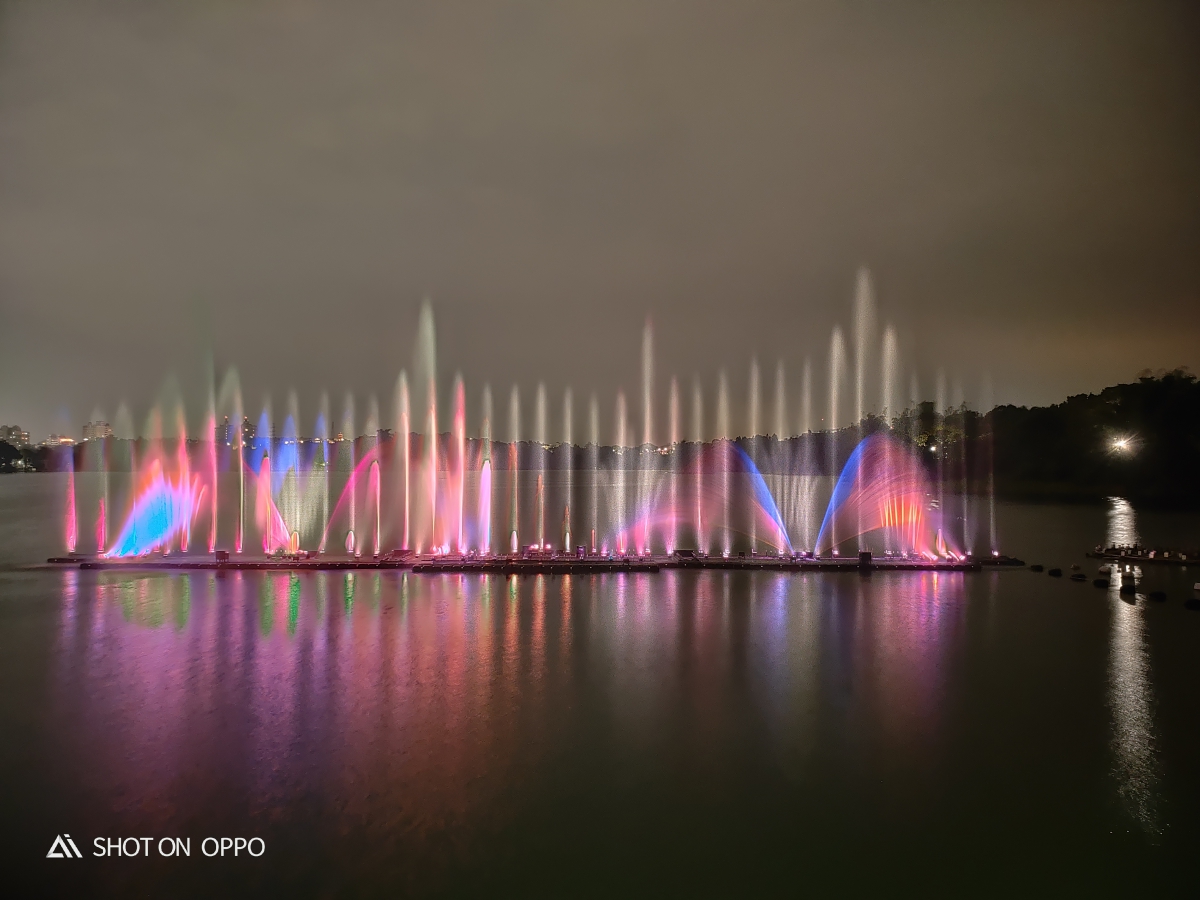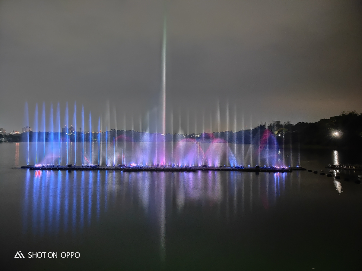 在嘉義蘭潭這裡會有水舞秀,阿湯去的時候剛好有搭上時間,試了一下用腳架搭配夜景模式,拍攝了四十秒,將水舞不同的燈光色彩混合了一起,變成了很夢幻的水舞照片。