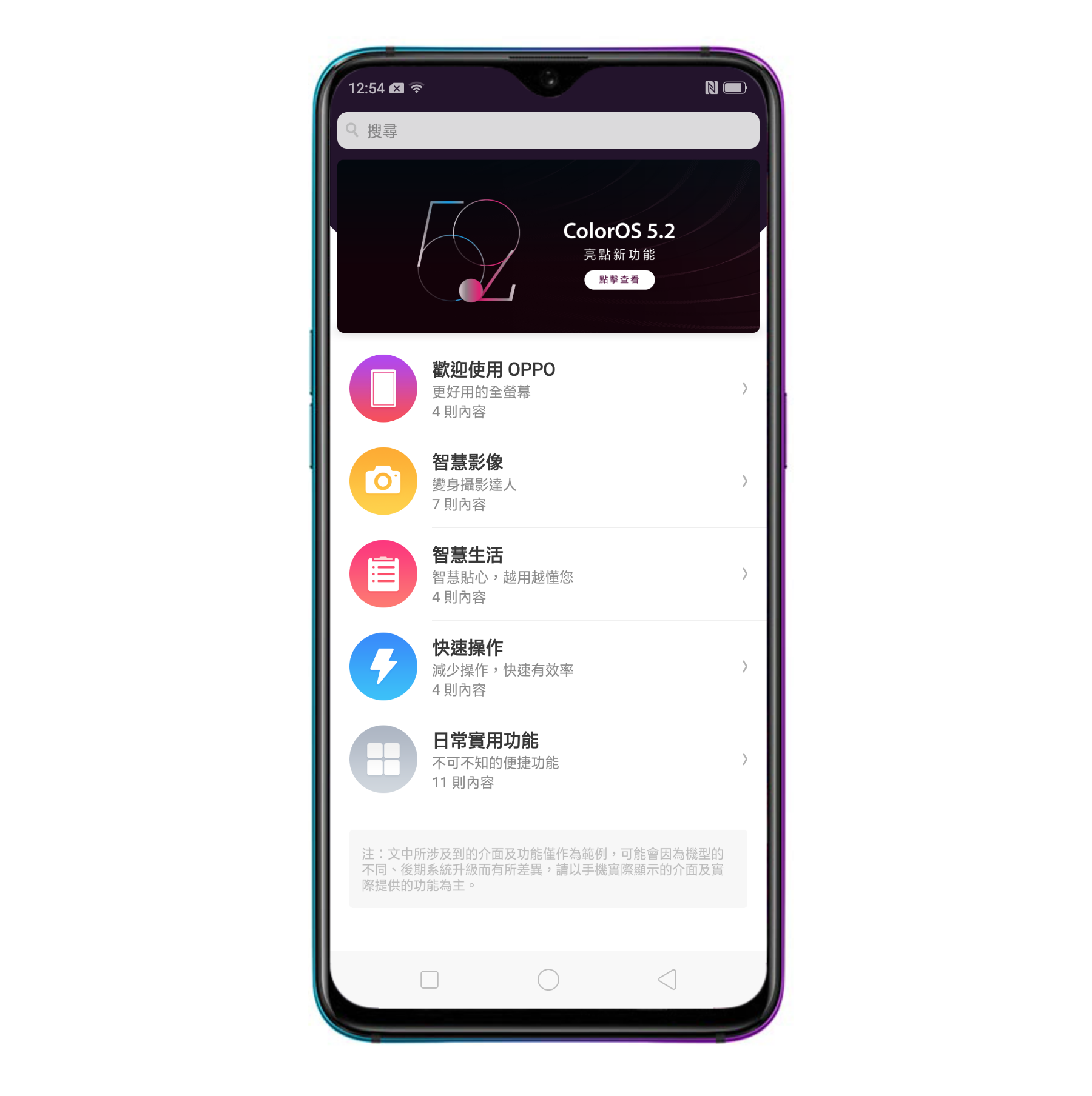這次搭載的 Color 5.2 除了在相機的部份帶來不少新功能外,系統其實也有很多實用的功能,如果你對於手機的使用上不夠熟悉,裡面都有預載使用技巧可以查看哦,或許你會發現一個新天地。