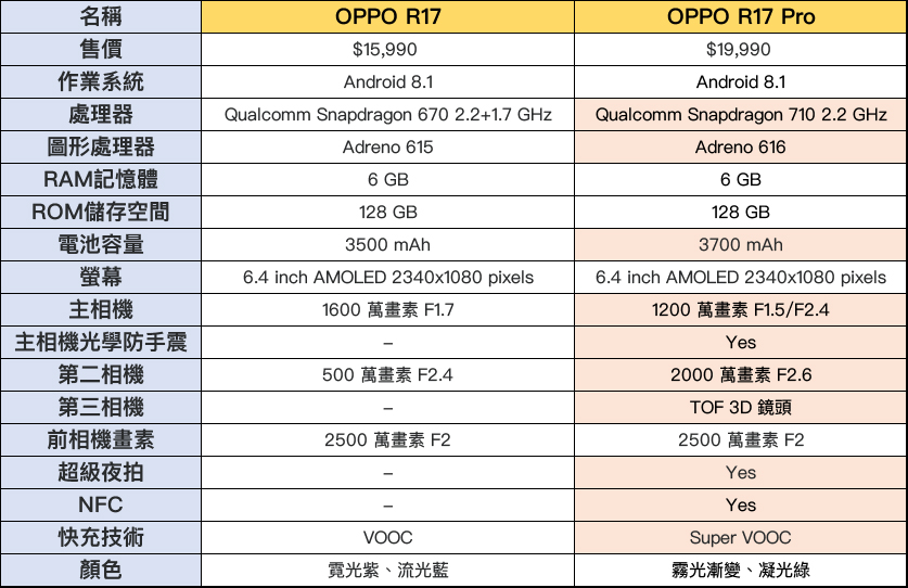 首先大家一定會對於 OPPO R17 及 R17 Pro 有什麼差異性,阿湯下面就簡單的列出一張對照表格,讓大家在做選擇時有個基準參考,差異的部份也為大家用顏色標註囉。