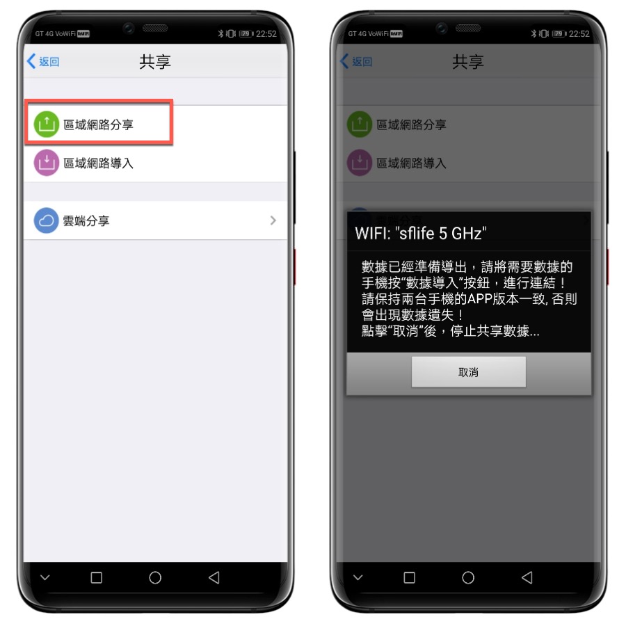 點擊區域網路分享後,會看到開始分享數據的字眼,先不要按取消,直接回到首頁後,換開啟剛剛下載的另一個 APP。