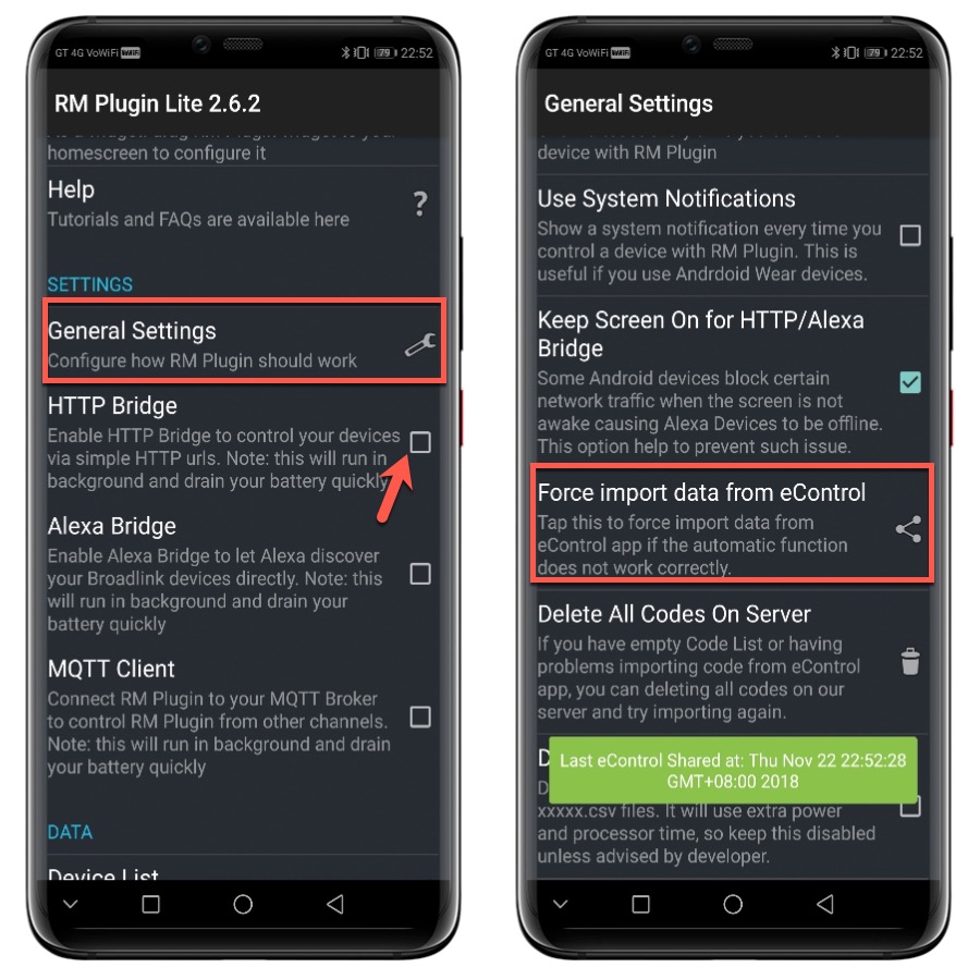 打開 Broadlink RM Plugin Lite 後,將 HTTP Bridge 勾選,並進入 General Settings,再點擊 Force import data from eControl。