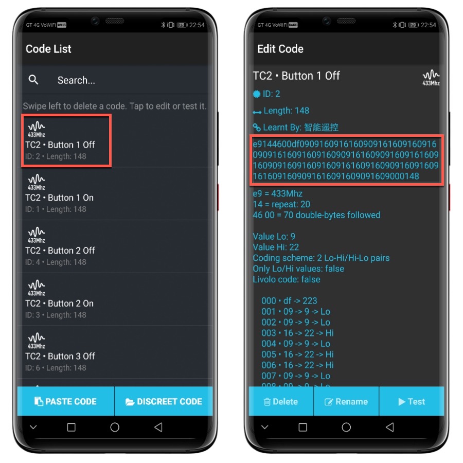 這邊就會列出取得的射頻代碼列表,以開關來說,開跟關會有不同的代碼,比如點擊 TC2 的第一開關的 Off,最前面那串代碼就是射頻碼,不過手機上無法複製,推薦大家可以用手機的 IP 在電腦瀏覽器上開啟看 code 比較好複製,網址會是 http://手機IP:9876/codes。