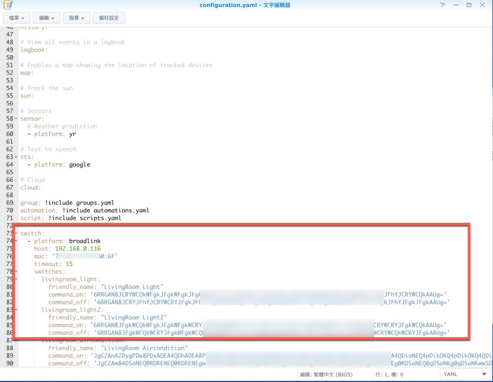 BroadLink 要串接進來蠻簡單的,只要 IP 跟 mac 位址,最麻煩的是電燈開關的射頻代碼,先提供大家 BroadLink 最基礎的代碼填法,只要編輯在檔案的最下方即可。
