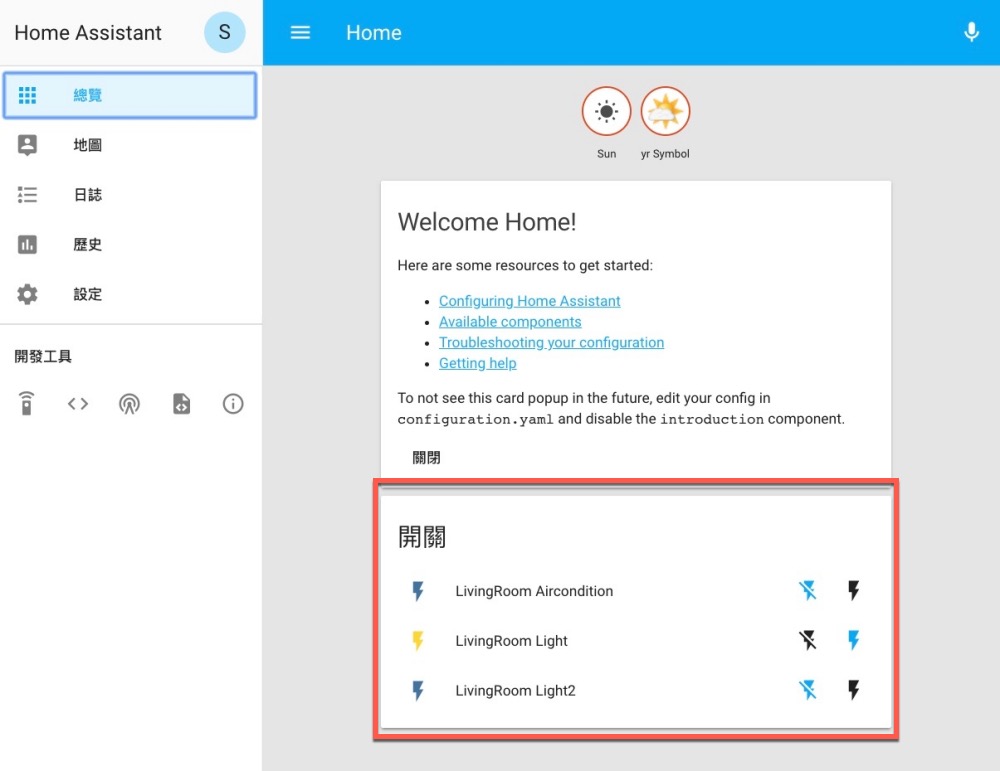 重啟後只要設定正確,就可以在總覽這一頁看到你設定好的開關,這時你可以先在網頁點擊看看這開跟關是否有正確運作,如果有的話,恭喜你已經成功一半了,接下來只要將 HA 串接到 HB 裡就可以了。