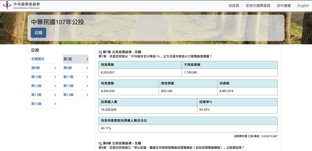 如果想要關心公投議題的開票情況,則能隨時利用網頁右上方的「至公投查詢」來看所有法案或是針對單獨案號查詢。