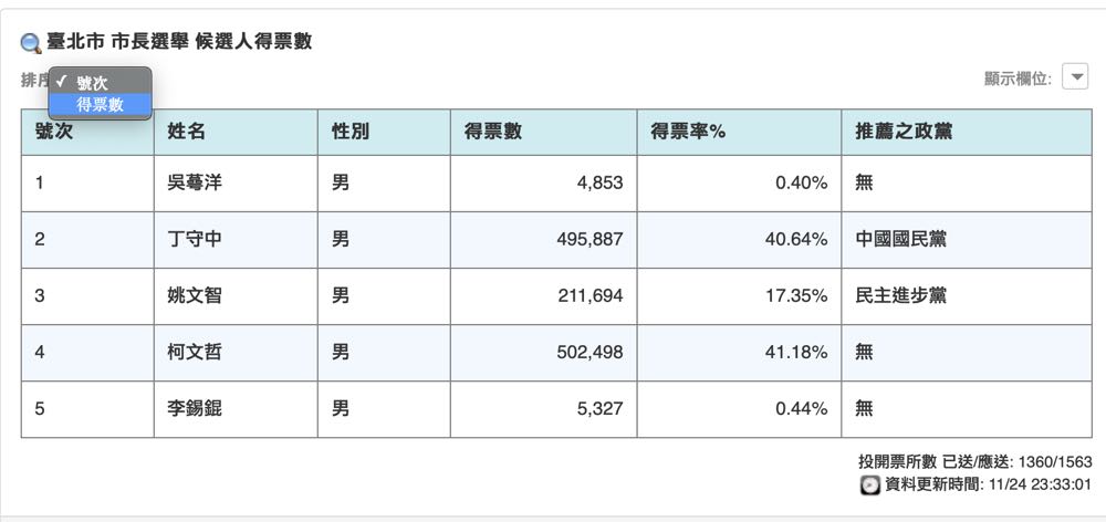 在得票情況的上方還能夠依據候選人的號次或是得票率來進行排序。