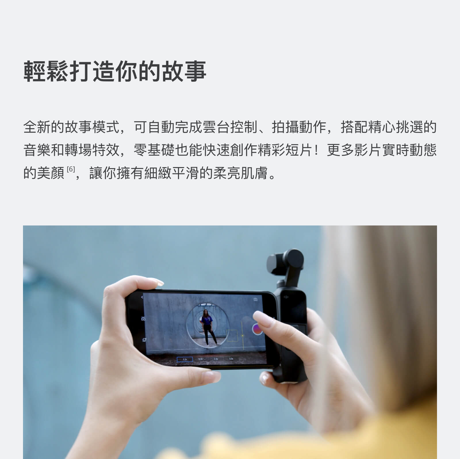 這款輕巧的 Osmo Pocket 可以說是麻雀雖小卻五臟俱全,在功能上具備有可以鎖定目標拍攝的「智能跟隨」、在自拍模式下的「人臉跟隨」、記錄光影變幻的「縮時攝影」、雲台橫滾軸會跟隨用戶手持的角度同步轉動,為影像增穩的同時保留了第一人稱視角的獨特視覺效果的「第一人稱視角模式」、以及能夠選擇 3x3 (拍攝 9 張拼接圖像)或 180 度模式(拍攝 4 張圖片)的「全景模式」讓用戶隨時都能輕鬆地記錄下動感瞬間。