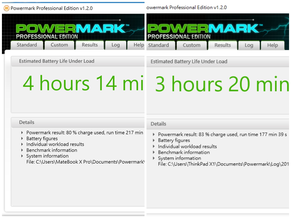 二款的電量跟快充能力其實沒有差太多,嚴格來說 MateBook X Pro 的電量是比 ThinkPad X1c 大上這麼一點,不過實際透過 PowerMark 的效能模式(也就是最耗電模式)進行測試,MateBook X Pro 比起 ThinkPad X1c 的續航時間再多上約 54 分鐘,在效能模式下可以差異到將近 1 小時的話,等於在一般使用下最多應該可以差異到 1.5~2 小時左右,雖然電量沒有差很大,但其實光是處理器第八代比第七代省電很多了。