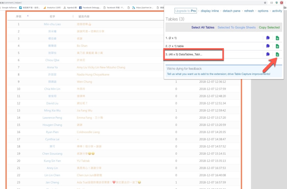 當你需要截取網頁上的表格時,只要點擊右上角 Table Capture 的圖示後,就會顯示所有偵測到的表格,那麼哪一個才是你想要複製下載的?當你滑鼠移過去時,網頁也會同步在該表格顯示橘色粗線外框,這樣你就知道是哪一個表格了,接下來按下綠色的試算表圖示。