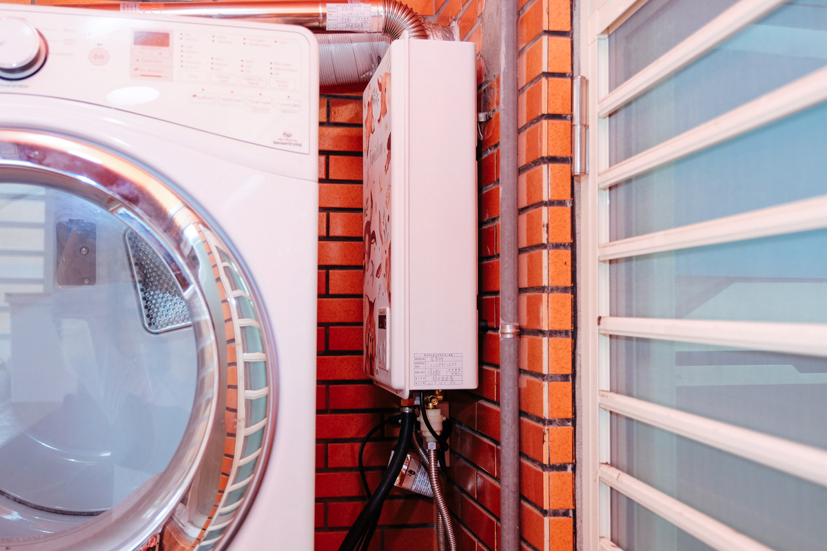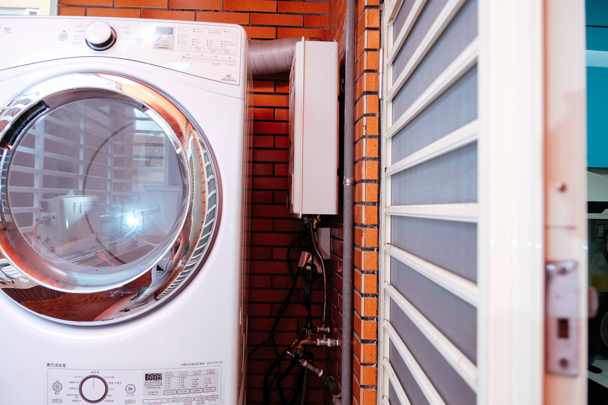 設備都在這邊,因為洗衣機有溫熱水功能,可以直接接熱水器的熱水,而烘衣機有蒸氣功能,剛好也直接接在熱水器的熱水,大家就都擠在同一個地方啦。