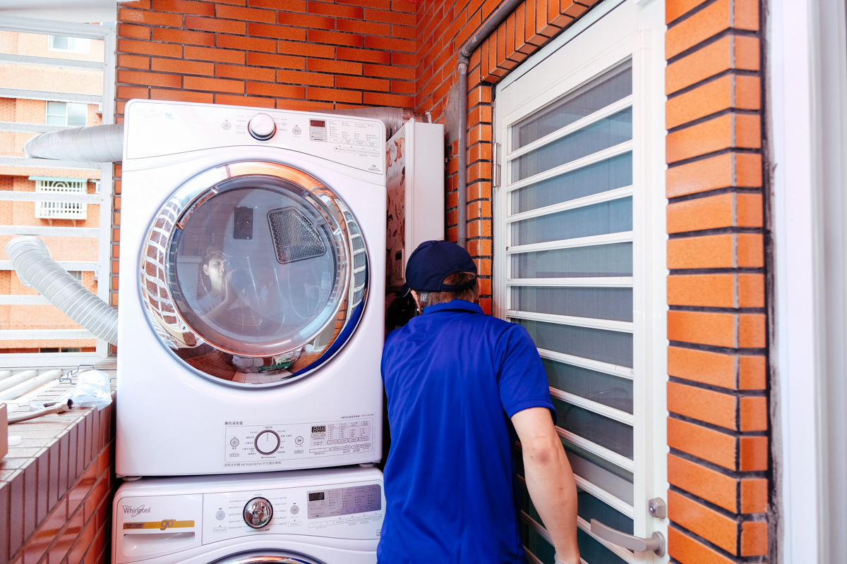阿湯因為熱水器旁還擺了洗烘衣機二台,其實技師是在狹縫中求生存的幫我拆換熱水器,原本事前在溝通時還以為要先將洗烘衣機移出來,不過因為熱水器原本的安裝架算是很通用,所以只需要將熱水器取下再掛上再配管線就搞定了,不然不移出來的話沒辦法鑽牆啊。
