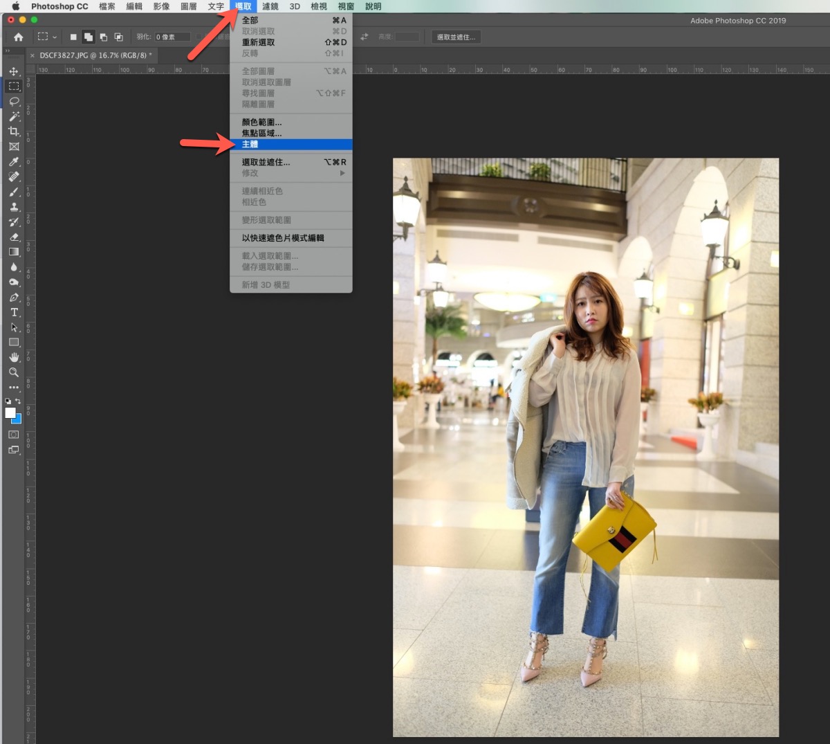 阿湯先隨便選擇了一張照片匯入 Photoshop,不論是 Windows 版或 Mac 版都一樣,在上方功能列的「選取」中,選用「主體」,然後就會自動分析並框出主體的邊緣,如果你沒看到該功能,應該是版本太舊。