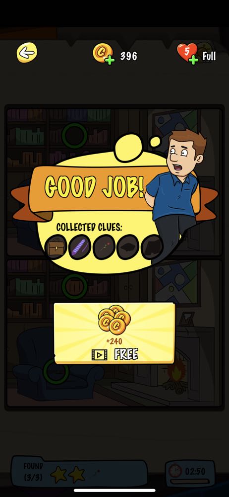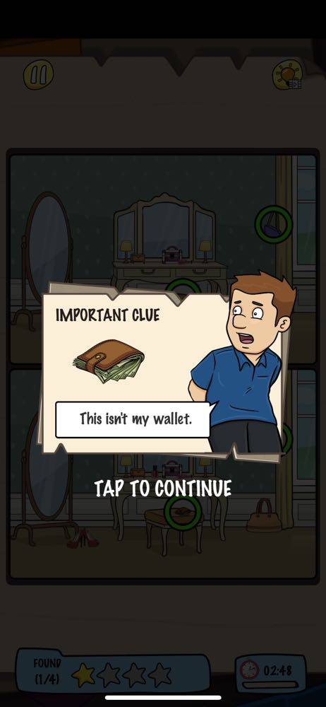 玩的過程中如果找不到,還能點選右上方的燈泡提示,從這遊戲的畫風、主題來說《 Find Differences: Her Secret 》可以說是大人版本的觀察力訓練遊戲,如果本身也是喜歡玩這類解謎遊戲的朋友,也能來幫主人翁一起找找他妻子的外遇證據吧!