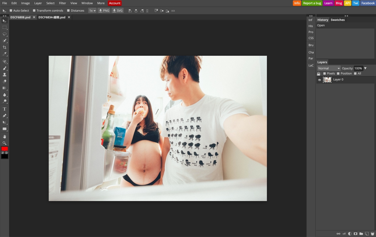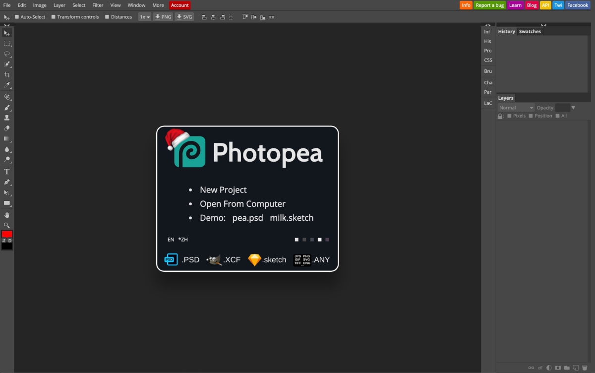 開啟網頁後,基本上看到這畫面,你會以為你開了 Photoshop,使用方式也跟 PS 差不多,檔案可以直接拖曳進來,也可以透過左上的 File 匯入。
