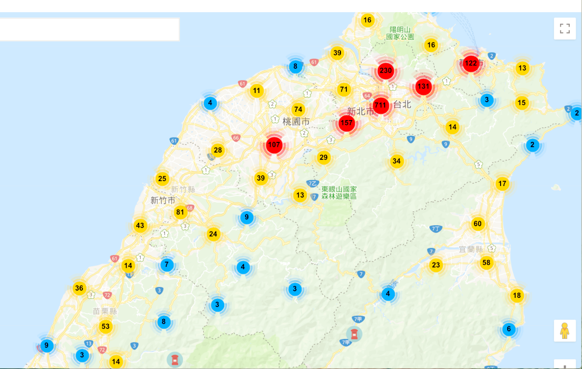 開啟地圖後可以看到全台灣的郵筒分佈狀況,連離島資訊都有,相當的完整,至於使用方式有二種,一種是直接依區域一直點擊進去。