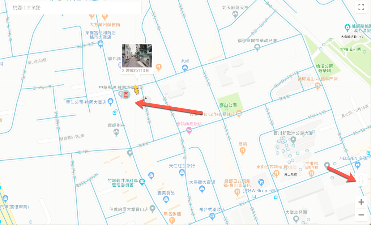 由於這是用 Google Maps 做為基底,當然街景也是可以使用,照平常用街景的方式,將小黃人拉到要看街景的地方就可以了。