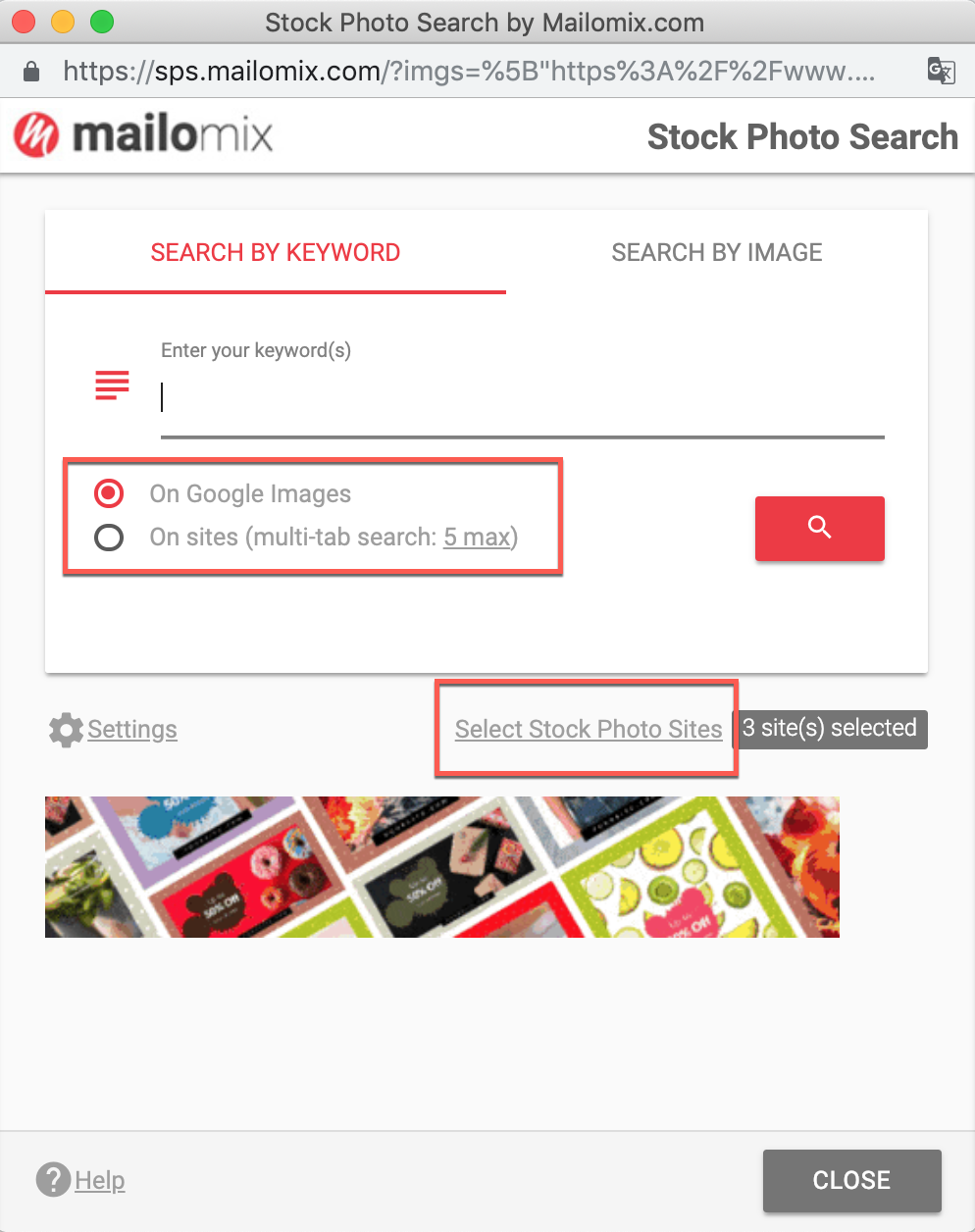 不論上述方式你選哪一種,都會得到同一個結果,出現這個視窗時就可以輸入關鍵字搜尋圖片了(要用英文比較好),然後阿湯的紅框處是可以額外設定的地方,先來說一下右下角的紅框,點擊後是可以選擇要搜尋的網站是哪些,預設只有三個。