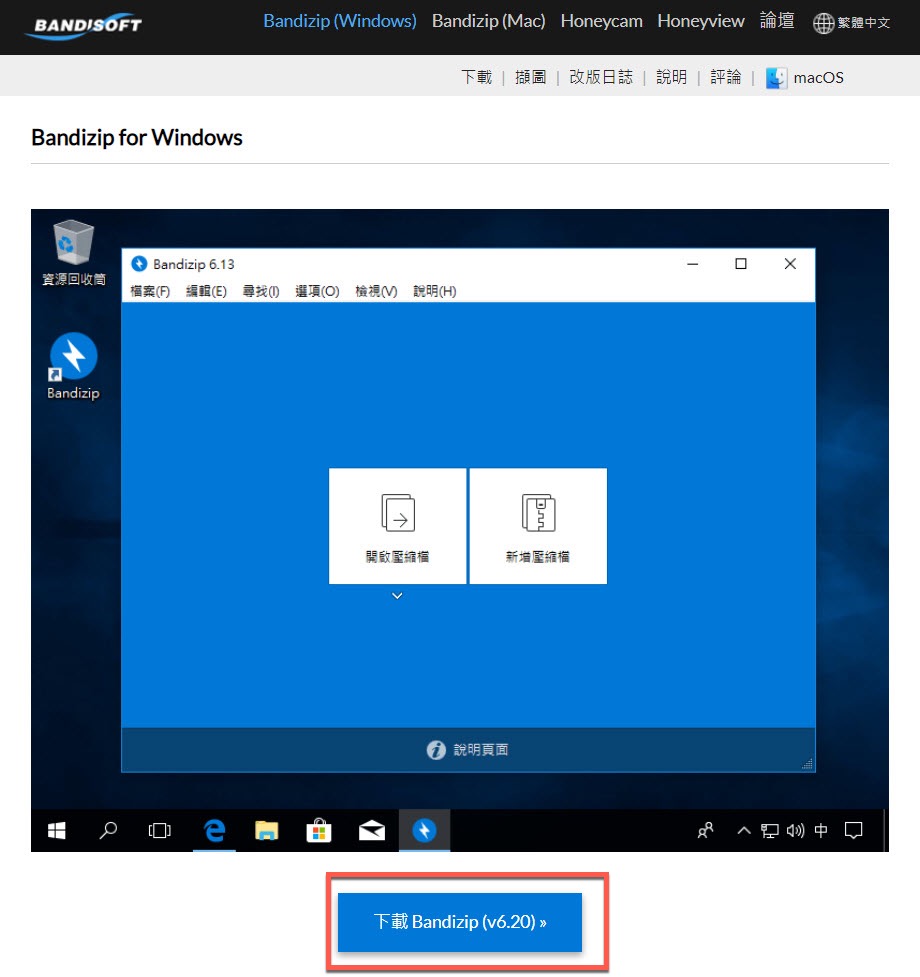 下載請到官方網站首頁後點擊下載 Bandizip。
