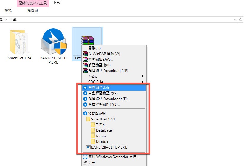 解壓縮的部份,比較特別的是可以在右鍵直接預覽該壓縮檔裡的內容,不需要開啟軟體,也是頗方便的一個功能。