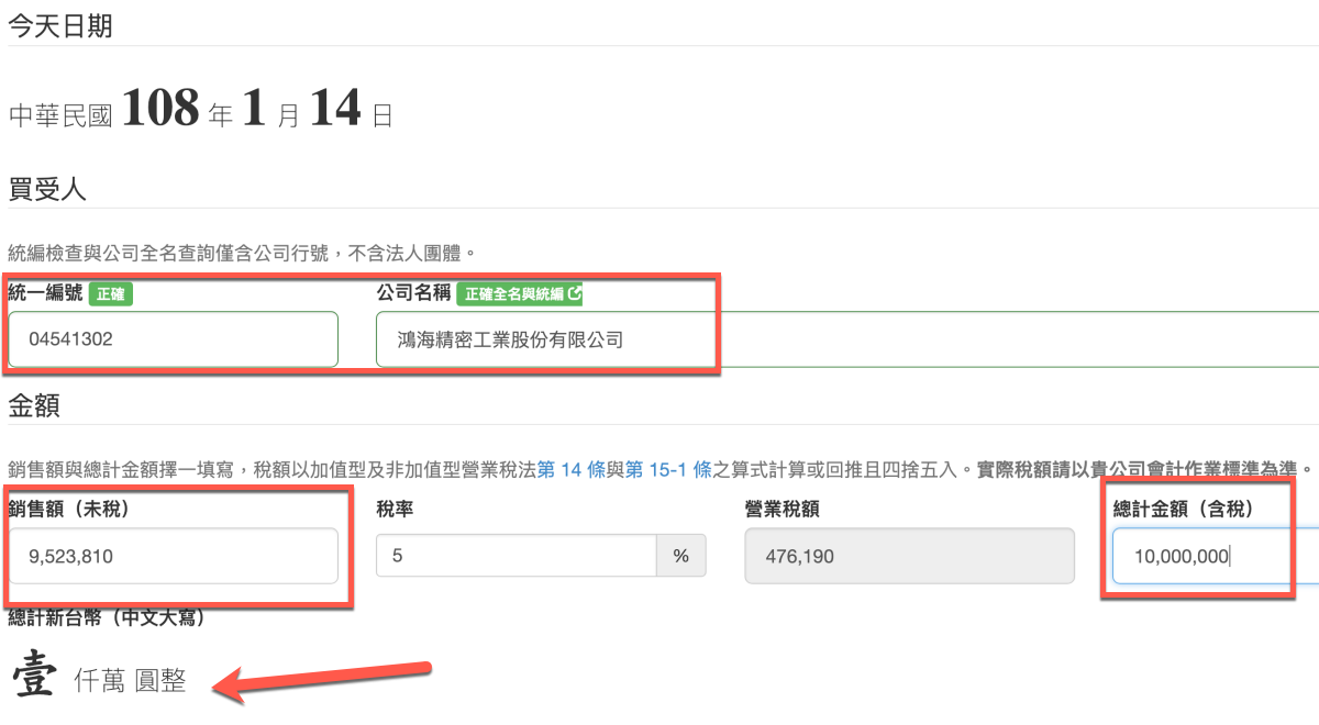 填寫統編後,公司名稱一秒就會自動幫你帶出來,金額的部份,不論你填未稅或含稅都可以,填未稅就會自動幫你算含稅,填含稅會反推未稅金額給你。
