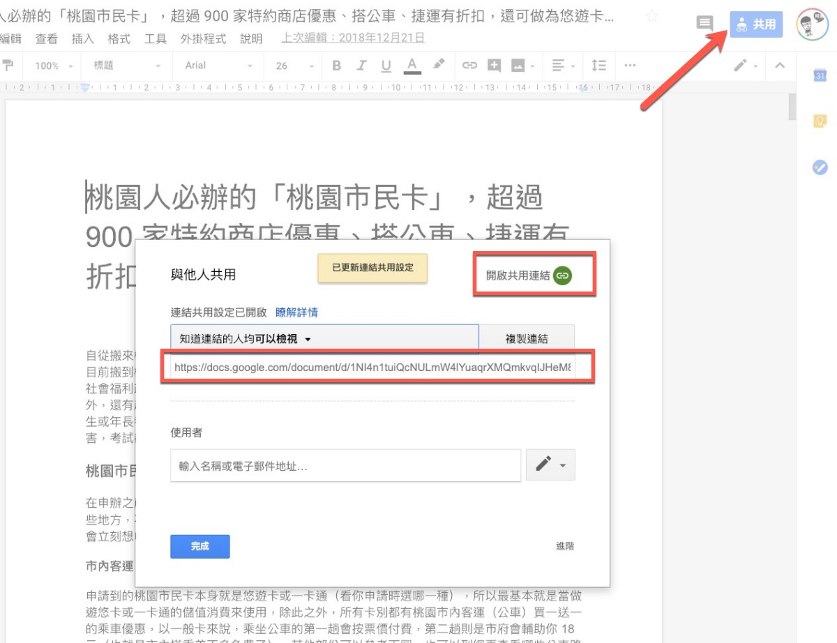首先我們照正常的共享檔案流程,先點擊右上角的共用後,再點擊「開啟共用連結」,接下來就會獲得一串分享連結,一般我們就是分享這一串連結給別人,不過直接分享就是給別人文件檔案,我們可以稍微修改一下連結,讓別人點擊是直接下載為 PDF,往下來看。
